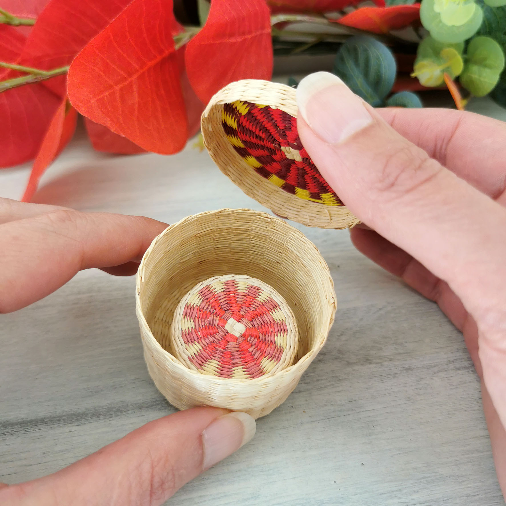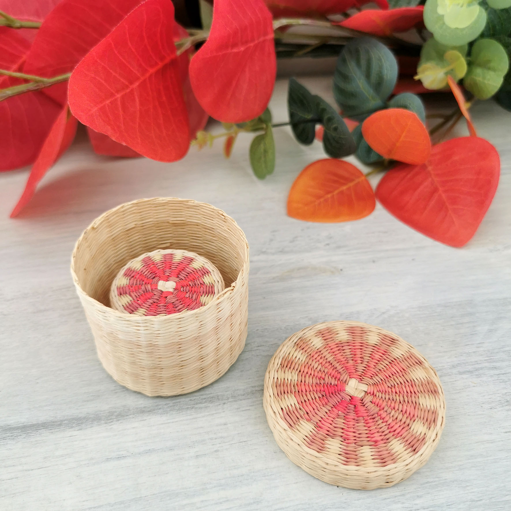 Ces deux adorables mini boites en fibres tressées séduisent par leur simplicité et leur charme naturel. Entièrement réalisées à la main, elles associent un tressage clair et régulier à un joli motif coloré sur le couvercle, apportant une touche chaleureuse et poétique.