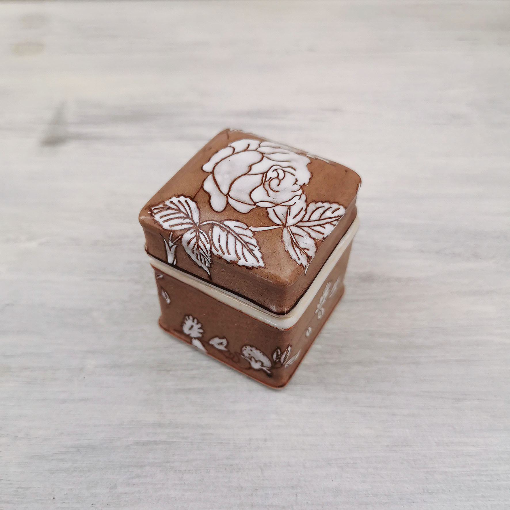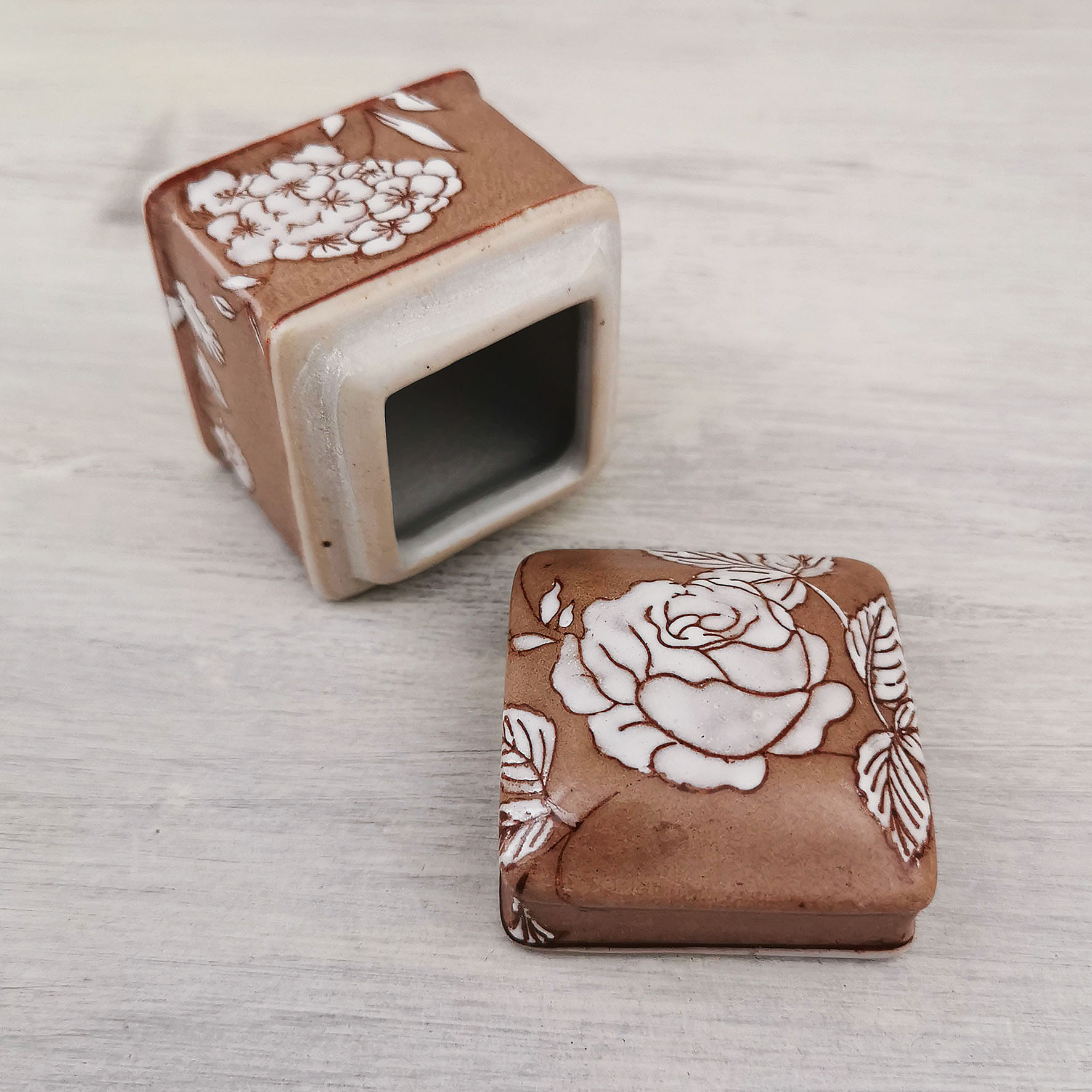 Cette délicate petite boite en céramique émaillée, de forme carrée, est une création signée Jardin d’Ulysse, marque française appréciée pour son univers raffiné et bucolique. Son décor floral blanc peint à la main contraste avec le fond brun satiné, offrant un rendu doux et romantique. Probablement produite dans les années 2000 à 2010, cette boîte témoigne du style chaleureux et poétique de la marque. En très bon état, elle conserve quelques traces d’utilisation très discrètes.