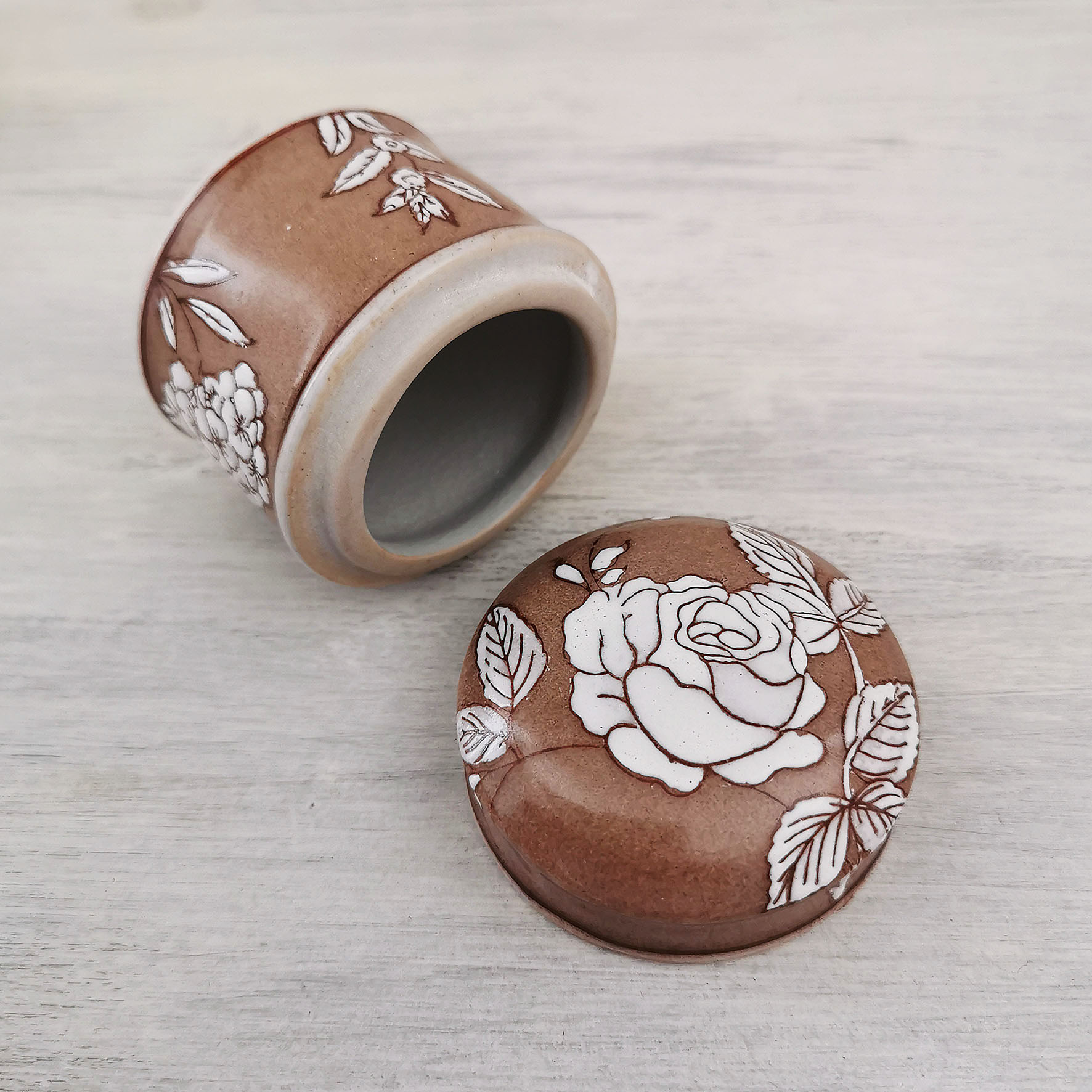Cette délicate petite boite en céramique émaillée, de forme ronde, est une création signée Jardin d’Ulysse, marque française appréciée pour son univers raffiné et bucolique. Son décor floral blanc peint à la main contraste avec le fond brun satiné, offrant un rendu doux et romantique. Probablement produite dans les années 2000 à 2010, cette boite témoigne du style chaleureux et poétique de la marque. En très bon état, elle conserve quelques traces d’usage très discrètes.
