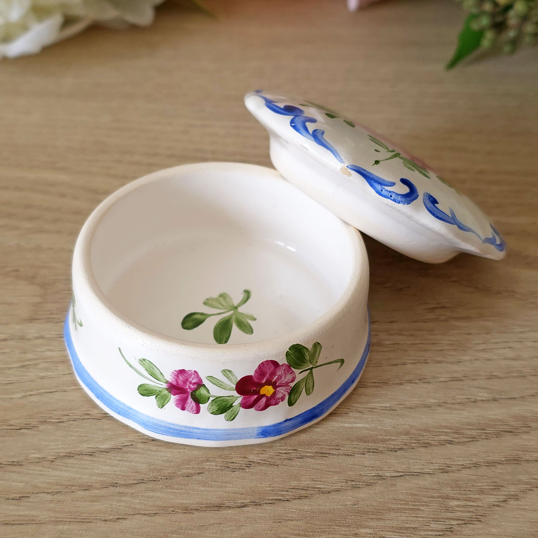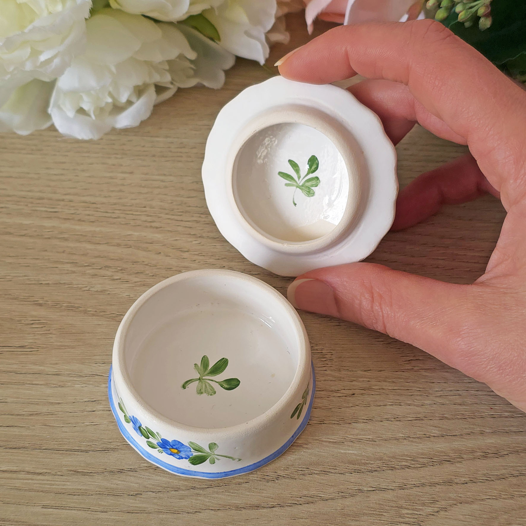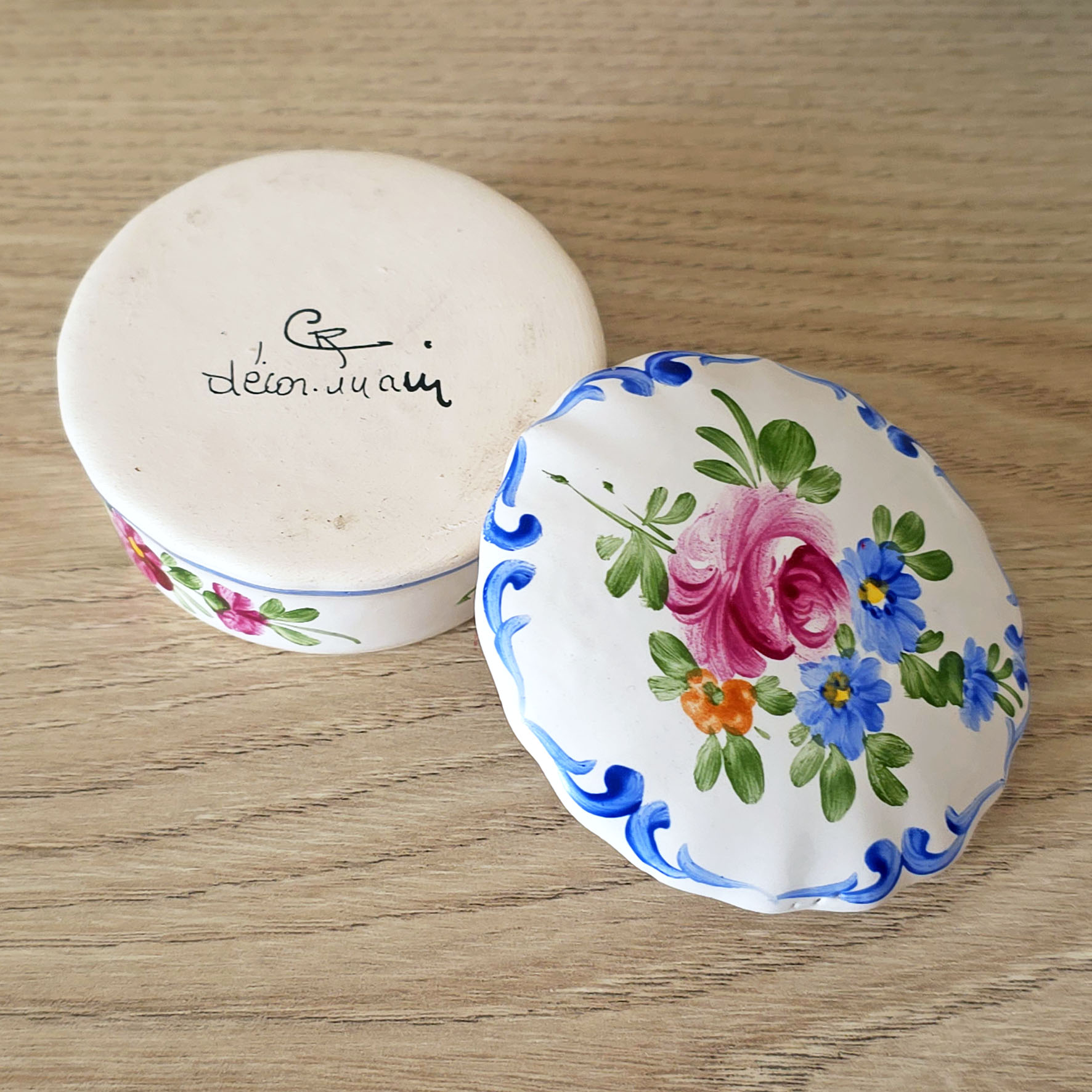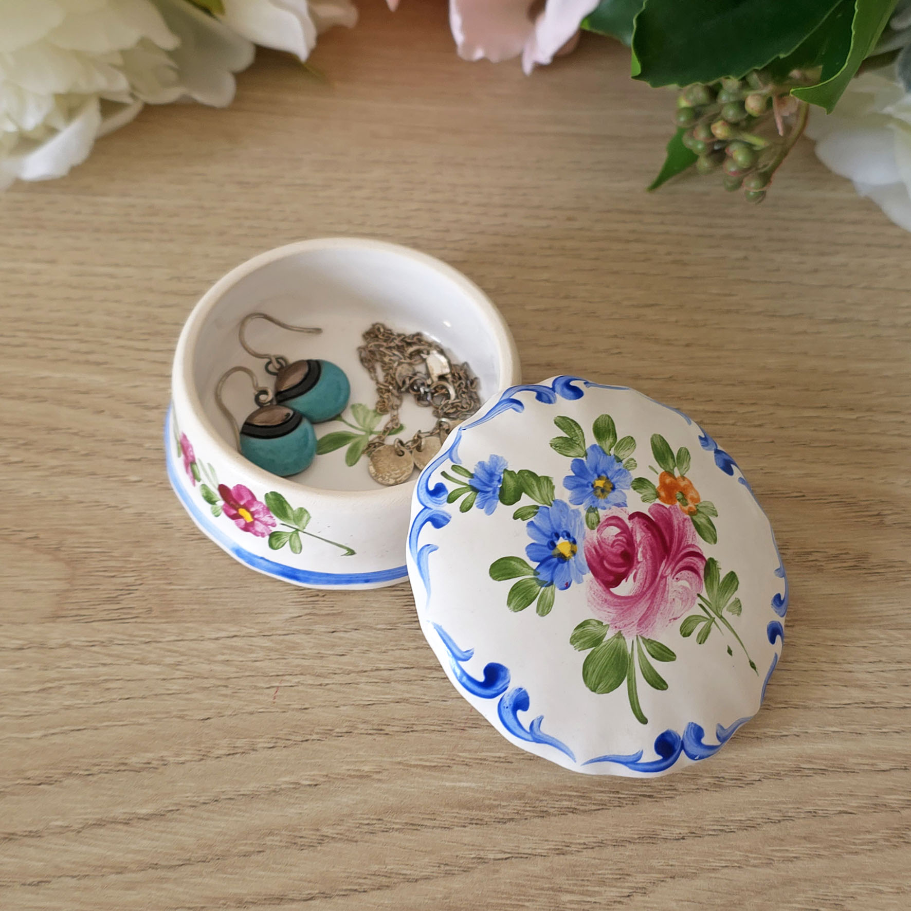 Avec son format délicat, cette boite est idéale pour accueillir de petits bijoux, bagues, ou souvenirs précieux. Elle est en très bon état vintage : aucun fêle, émail sain, avec simplement un minuscule éclat discret sur le bord du couvercle, à peine visible et signalé sur les photos, ainsi que de légères traces du temps sous la base, parfaitement cohérentes avec son âge.