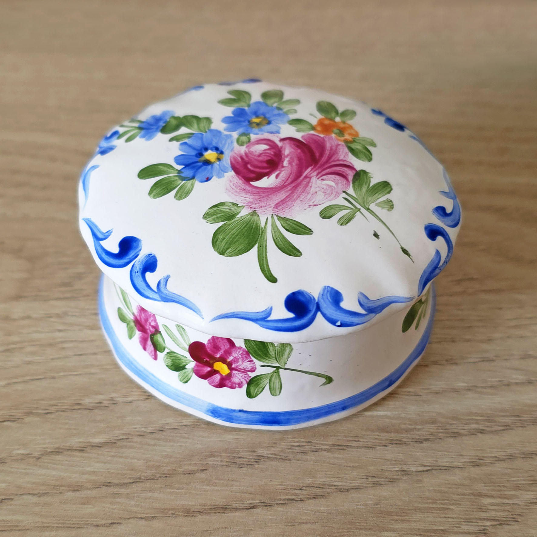 Cette charmante petite boite ronde vintage en porcelaine émaillée séduit par son décor floral délicatement peint à la main : une rose centrale entourée de fleurs bleues, d’une petite touche orangée et de feuillages verts, soulignés par une frise bleue stylisée réalisée à main levée. Le couvercle légèrement festonné lui donne une silhouette douce et rétro, typique des productions européennes du milieu du XXᵉ siècle.